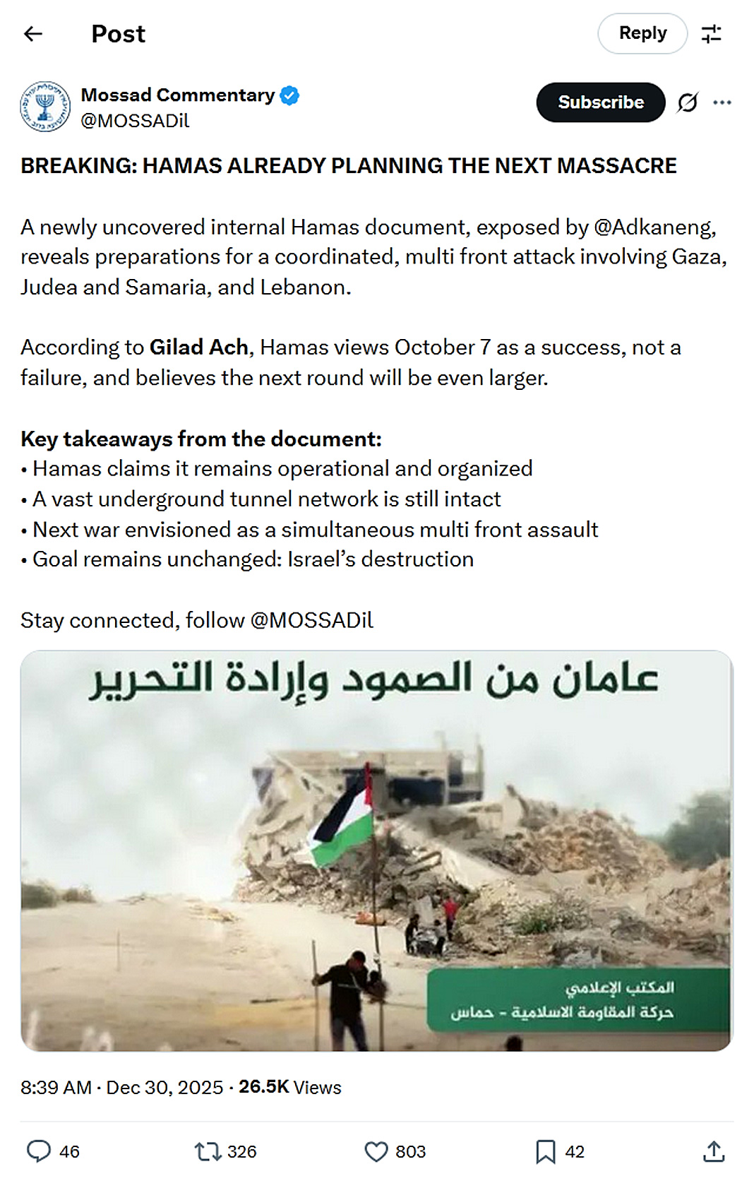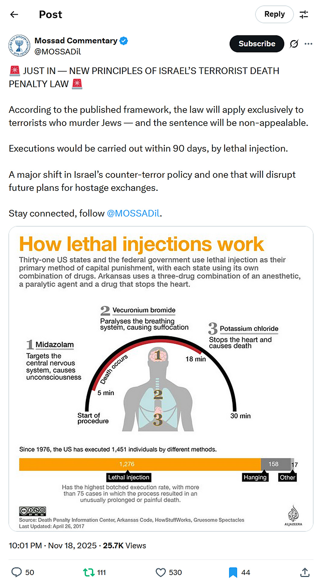Mossad Commentary-tweet-18November2025-Israel terrorist death penalty law