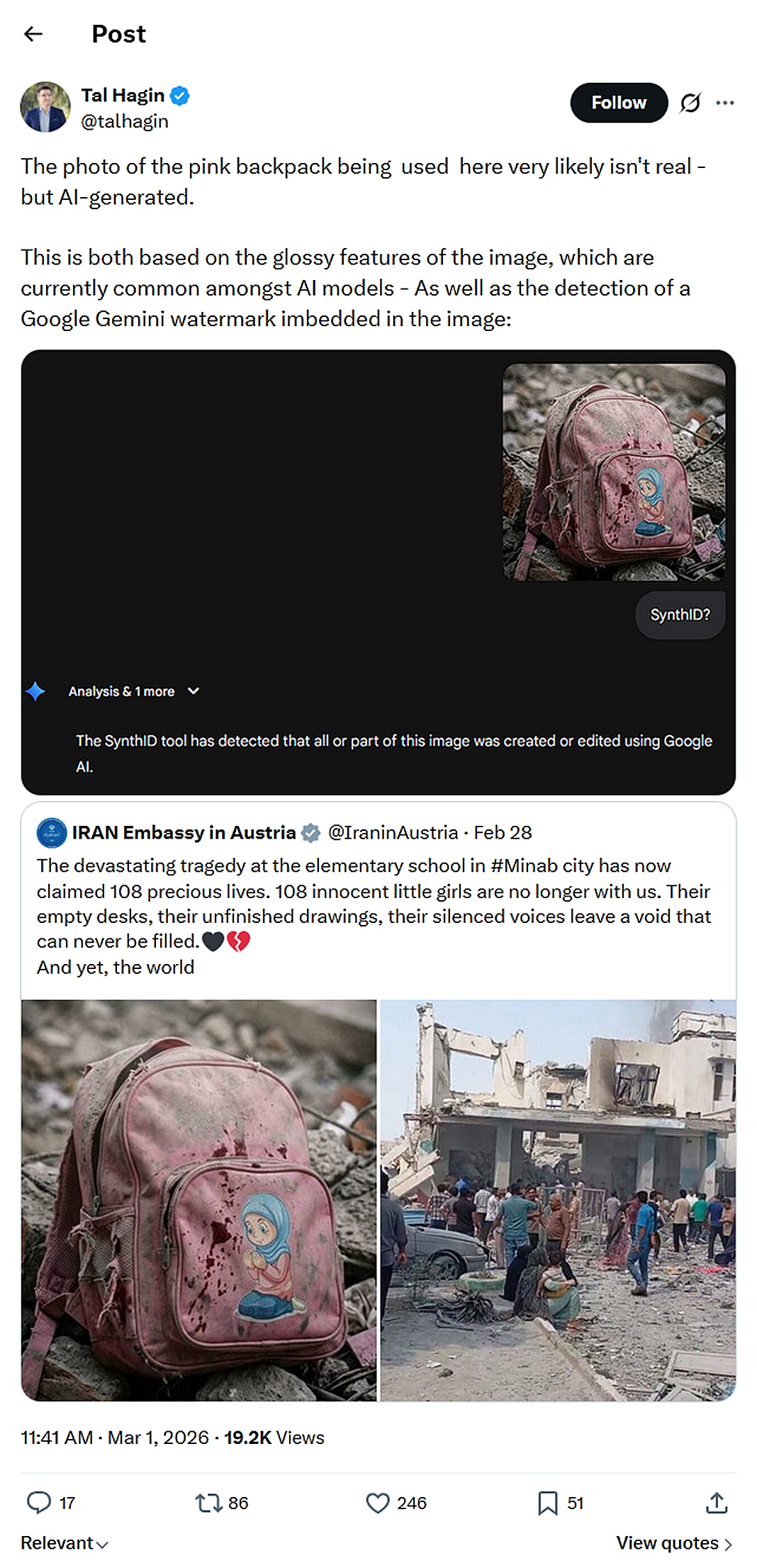 The Iranian Embassy in Austria continued with the disinformation campaign on behalf of the regime, sharing a now-viral image on X of a backpack that reportedly belongs to one of the schoolgirls killed in the strike. However, research analysts have found the photo to be AI-generated, as a Google Gemini watermark was detected hidden in the image.