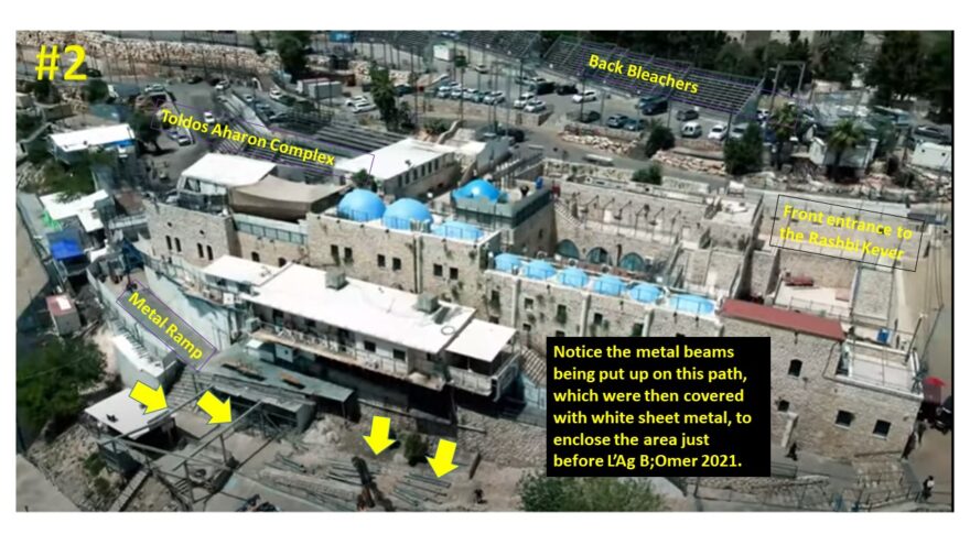 It also seems to show that one Border Policeman had enough of a neshama to start trying to rip down the metal sheeting right next to the blocked exit, to try to relieve the pressure and give people more space. But notice other policemen standing at the bottom of the stairs, still holding the crowds back.==== Next, you see the ‘river’ of visitors coming down the fenced-in path with the metal ramp.I suspect that fencing was also put up around the sides just for this L’ag B’Omer, but I haven’t been able to confirm that yet.