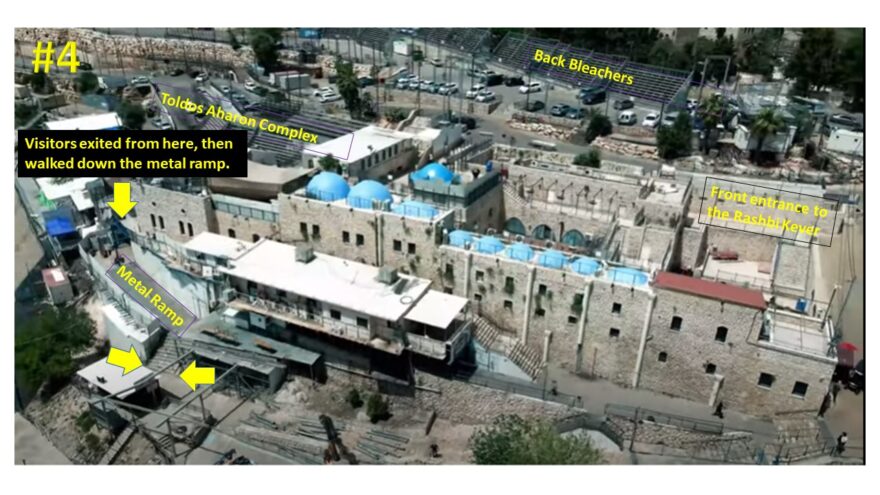 ==== The timings on the slides below appear to be wrong – the crush built up much faster, and seems to have been caused by 10 policemen and at least one policewoman blocking the exit, with or without gates. The footage is conveniently ‘cut’ at the crucial part that would show why people suddenly stopped on the stairs. You can see it for yourself HERE: https://www.mako.co.il/news-israel/2021_q2/Article-249099ac79d3971026.htm ==== I’d been poring over media accounts for three days, and still couldn’t really understand how this was meant to have happened. So yesterday morning, I grabbed my camera and decided I had to go and see things for myself, to see if that would bring a bit more clarity to the picture. In this post, I’m going to first bring the cold, hard facts – as much as they are knowable, with so many big parts of the puzzle still missing. And then maybe in a different post, I’ll tell you more about some of the interesting things that were going on up in Meron, and more of what I heard from some of the people there. Ready? Let’s do it. ==== Identifying where the deaths occurred.I’ve seen so many pictures of stairs next to white sheet metal fencing – that I totally didn’t recognise. So, the first job was to go and actually find the place where the 45 Meron Martyrs were killed al kiddush Hashem. (More on how that actually happened below, after we get the cold, hard facts set down). The following stills come from THIS drone footage of Meron, shot on April 30th, 2021.(I’m working on doing this as a short video, too, if I can figure it out – see the update below.) ==== How 45 people died in Meron, on L’ag B’omer 2021: