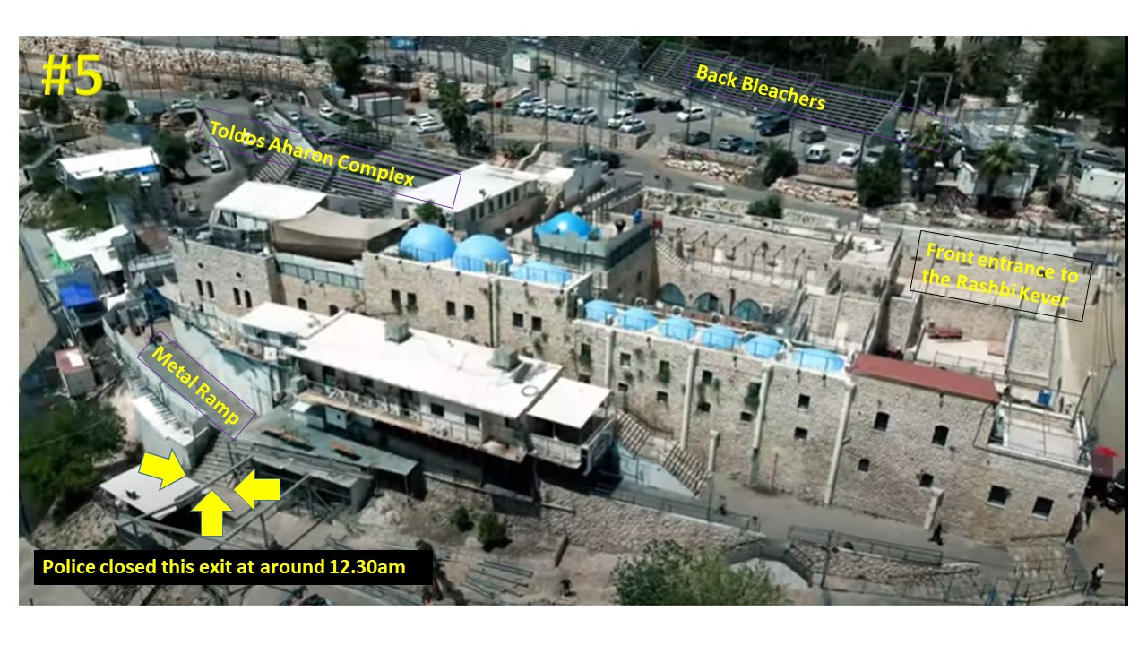 And I also want to include this information, from another eye-witness, that was reported in Hebrew HERE, that the single exit out of the Toldos Aharon complex was blocked by 10 burly policemen, plus at least one policewoman who were pushing people back up the stairs and the ramp, just before the ‘disaster’ (in Hebrew): https://go.bhol.co.il/31eLuS ==== Google translated snippet: