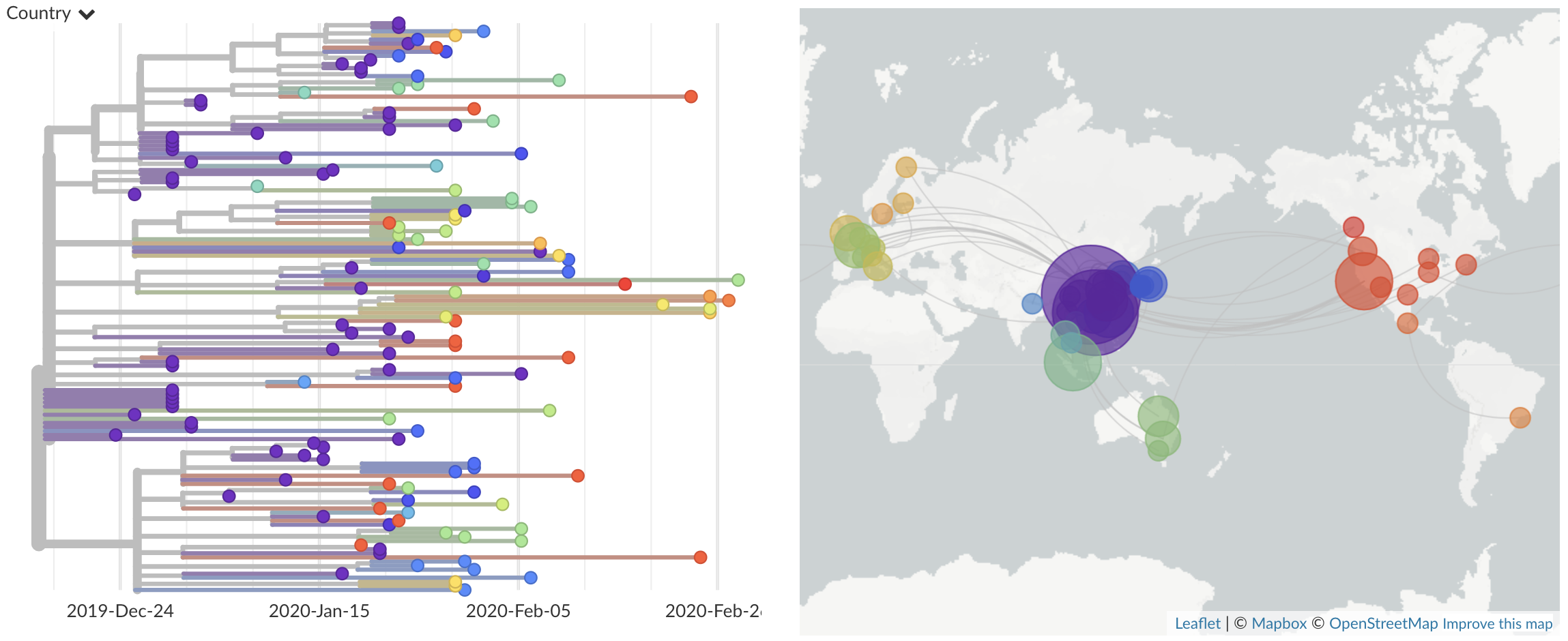 We could take the “genomes” ATTT, ATCT and GTCT and infer that the infection with sequence ATTT lead to the infection with sequence ATCT and this infection lead to the infection with sequence GTCT. This approach allows us learn about epidemiology and transmission in a completely novel way and can supplement more traditional contact tracing and case-based reporting. For a few years now, we’ve been working on the Nextstrain software platform, which aims to make genomic epidemiology as rapid and as useful as possible. We had previously applied this to outbreaks like Ebola, Zika and seasonal flu. Owing to advances in technology and open data sharing, the genomes of 140 SARS-CoV-2 coronaviruses have been shared from all over the world via gisaid.org. As these genomes are shared, we download them from GISAID and incorporate them into a global map as quickly as possible and have an always up-to-date view of the genomic epidemiology of novel coronavirus at nextstrain.org/ncov. The big picture looks like this at the moment: