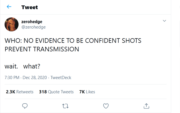 ![]() zerohedge-tweet-28December2020-Covid-vaccine WHO: NO EVIDENCE TO BE CONFIDENT SHOTS PREVENT TRANSMISSION Some on twitter scoffed at the comment.