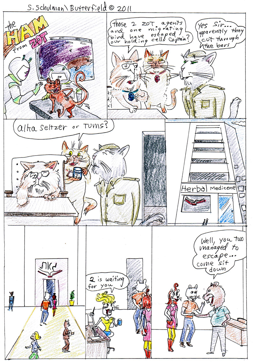 Aliens petting Monkey M.E.O.W. Headquarters; Two cats and the Captain, Cat 1: “Those 2 ZOT agents and one migrating bird have escaped our holding cells Captain?” Captain: “Yes Sir… Apparently they cut through the bars.” Cat 2 to Cat 1: “Alka-Seltzer or Tums?” At ZOT Headquarters: Agent 30 (Miss. Sweetums):”2 is waiting for you.” Agent 2 (the Boss): “Well, you two managed to escape… Come, sit down.” |