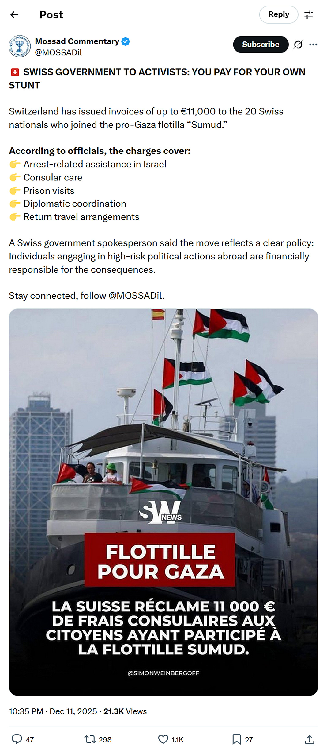 Switzerland has issued invoices of up to €11,000 to the 20 Swiss nationals who joined the pro-Gaza flotilla “Sumud.” According to officials, the charges cover: A Swiss government spokesperson said the move reflects a clear policy: Stay connected, follow @MOSSADil.