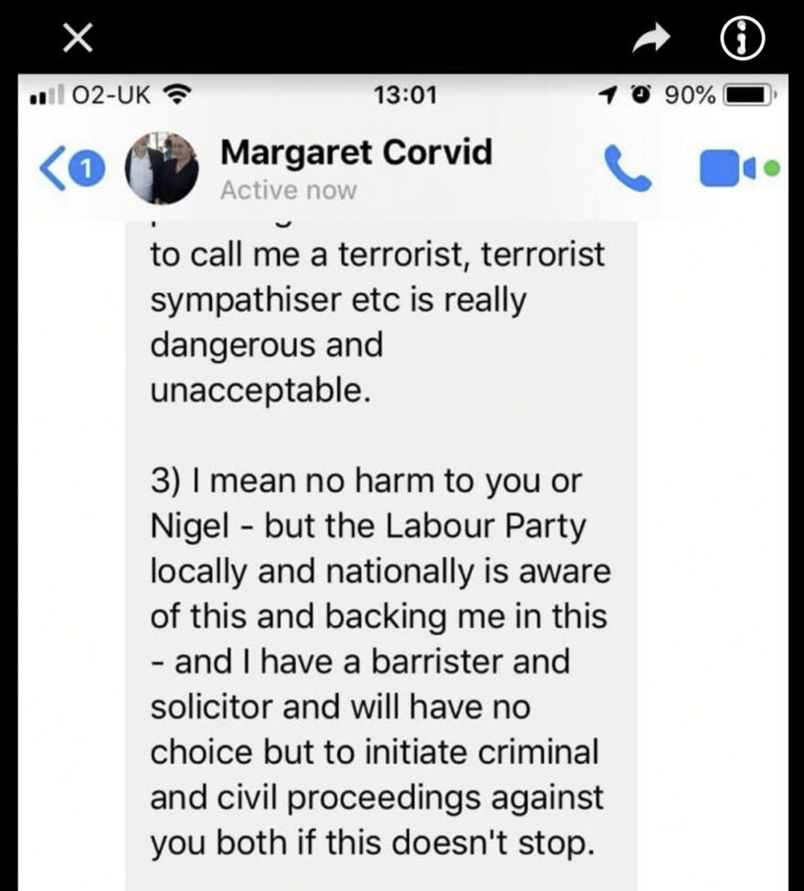 Threats and Labour PartyIt gets even more troubling. When I was doing research for my initial piece, I found that some people had publicly contacted Corvid making the accusation she was a terrorist sympathiser and antisemite. Corvid responded with threats. She told the accuser that the ‘Labour Party is aware’ and if they didn’t stop making the accusations, she or they (the message is not clear) will take legal action. Publicly she called people who approached her over antisemitism – ‘trolls’. Whatever else is in this message – the threatening tone is clear and Corvid is explicitly saying that by this point – the Labour Party knew about her antisemitic actions and her extremism and were ‘backing her’: So, who knew she was an extremist and had promoted the play Perdition? Local Labour leader Tudor Evans was tagged into tweets on the subject of Margaret the extremist Councillor in March 2019, but it goes back even further. In Corvid’s recent statement she is explicit. She says this: ‘I reported them to Deputy Council Leader Pete Smith and Chief Whip Eddie Rennie in November 2018 in a face to face meeting.’ she goes on to say she has ‘kept them informed’. Which means we need to ask Pete Smith and Eddie Rennie why action wasn’t take against Margaret Corvid until my research in this blog exposed the story?